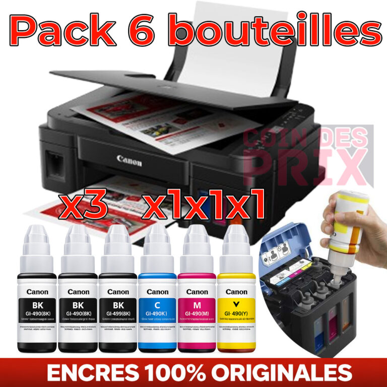 Pack Imprimante Canon Couleur Multifonction Wi-Fi G3410 + 3 d’encre Noires + 3 d’encres Couleurs